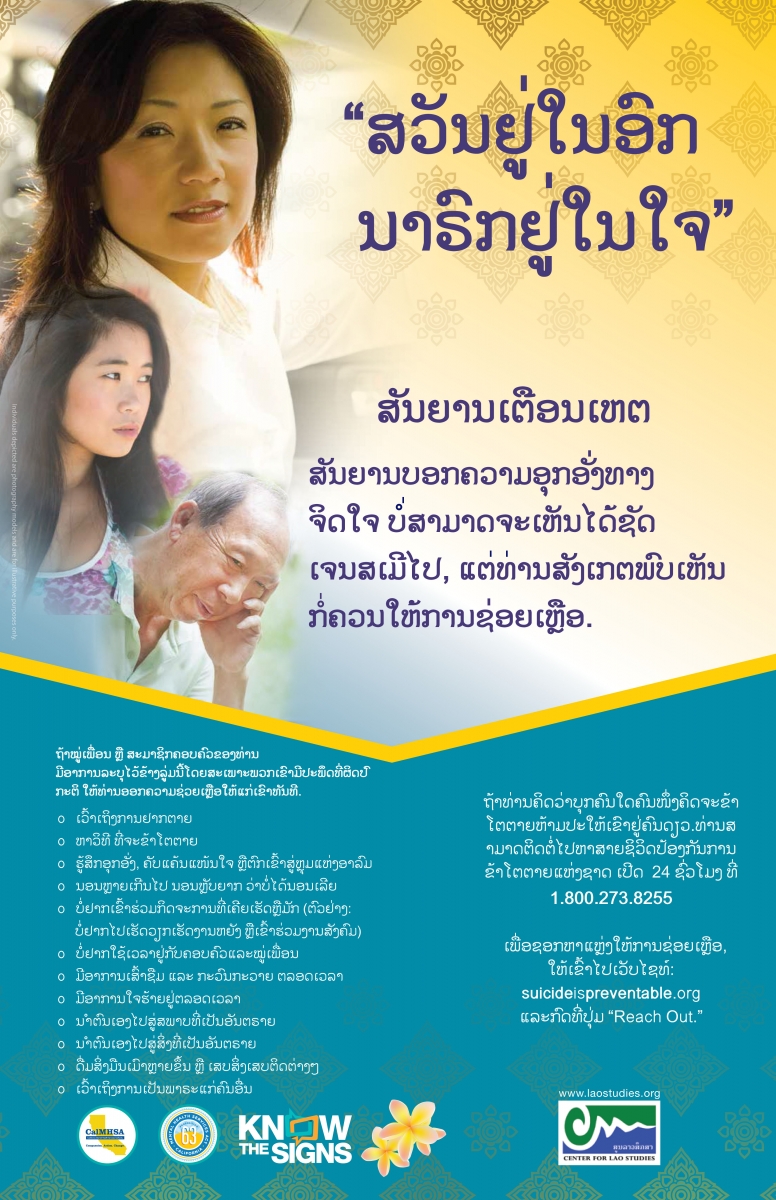 Know the Signs is a California statewide suicide prevention campaign based on educating Californians how to recognize warning signs of suicide, how to find the words to have a conversation with someone who is thinking about suicide, and where to find professional help and resources. Suicide is not often discussed in the Lao community and there are not many resources for Lao people who might be thinking about harming themselves. CLS was glad to be able to provide translation services for Lao language outreach material regarding suicide prevention so that community members do not have to suffer in silence. If you or your organization are interested in recieving pamphlets and posters, contact: info@laostudies.org.